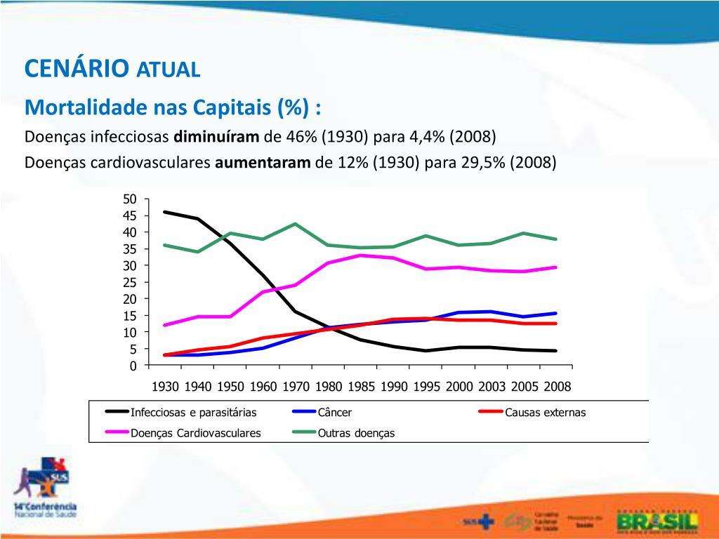 CENÁRIO ATUAL Mortalidade nas Capitais (%) : Doenças infecciosas diminuíram de 46% (1930) para 4,4% (2008) Doenças cardiovasculares aumentaram de 12% (1930) para 29,5% (2008)