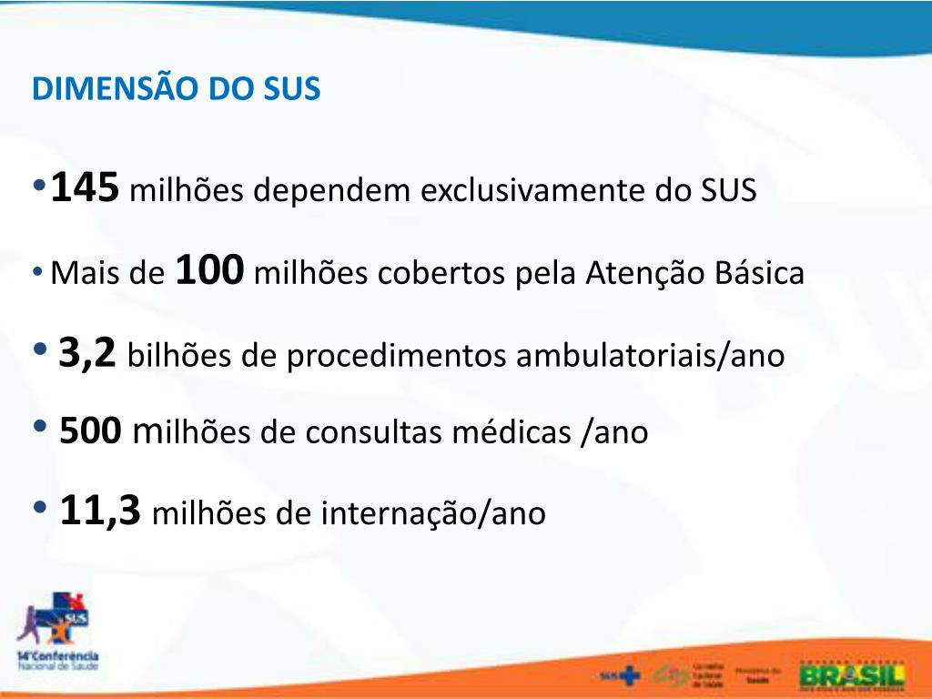 DIMENSÃO DO SUS • 145 milhões dependem exclusivamente do SUS • Mais de 100 milhões cobertos pela Atenção Básica • 3,2bilhões de procedimentos ambulatoriais/ano • 500 milhões de consultas médicas /ano • 11,3milhões de internação/ano