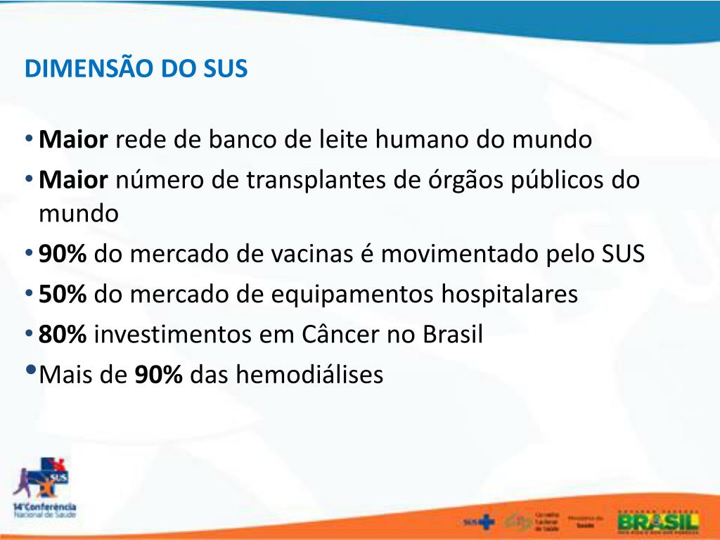 DIMENSÃO DO SUS • Maior rede de banco de leite humano do mundo • Maior número de transplantes de órgãos públicos do mundo • 90% do mercado de vacinas é movimentado pelo SUS • 50% do mercado de equipamentos hospitalares • 80% investimentos em Câncer no Brasil • Mais de 90% das hemodiálises