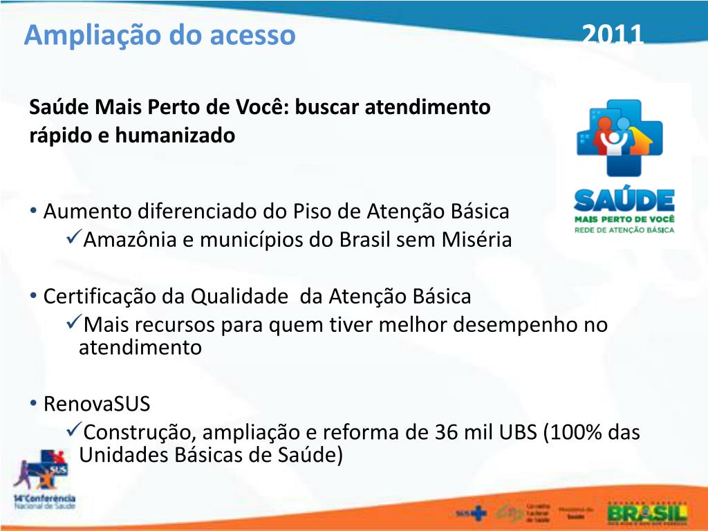 Ampliação do acesso 2011 Saúde Mais Perto de Você: buscar atendimento rápido e humanizado • Aumento diferenciado do Piso de Atenção Básica • Amazônia e municípios do Brasil sem Miséria • Certificação da Qualidade da Atenção Básica • Mais recursos para quem tiver melhor desempenho no atendimento • RenovaSUS • Construção, ampliação e reforma de 36 mil UBS (100% das Unidades Básicas de Saúde)