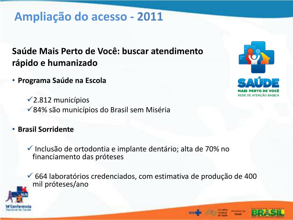 Ampliação do acesso - 2011 Saúde Mais Perto de Você: buscar atendimento rápido e humanizado • Programa Saúde na Escola • 2.812 municípios • 84% são municípios do Brasil sem Miséria • Brasil Sorridente • Inclusão de ortodontia e implante dentário; alta de 70% no financiamento das próteses • 664 laboratórios credenciados, com estimativa de produção de 400 mil próteses/ano