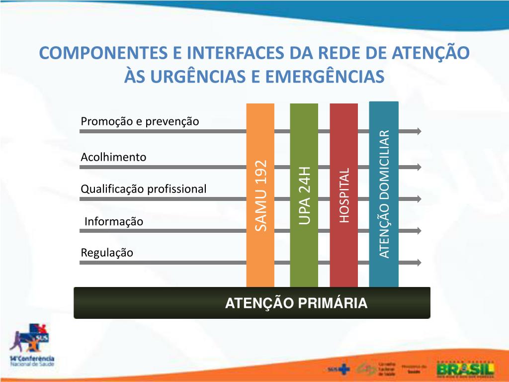 COMPONENTES E INTERFACES DA REDE DE ATENÇÃO ÀS URGÊNCIAS E EMERGÊNCIAS ATENÇÃO DOMICILIAR SAMU 192 UPA 24H HOSPITAL Promoção e prevenção Acolhimento Qualificação profissional Informação Regulação ATENÇÃO PRIMÁRIA