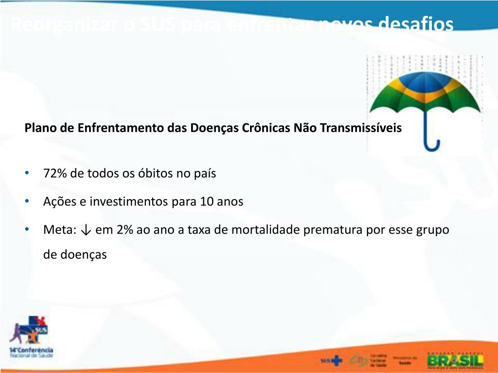 Reorganizar o SUS para enfrentar novos desafios Plano de Enfrentamento das Doenças Crônicas Não Transmissíveis • 72% de todos os óbitos no país • Ações e investimentos para 10 anos • Meta: ↓ em 2% ao ano a taxa de mortalidade prematura por esse grupo de doenças