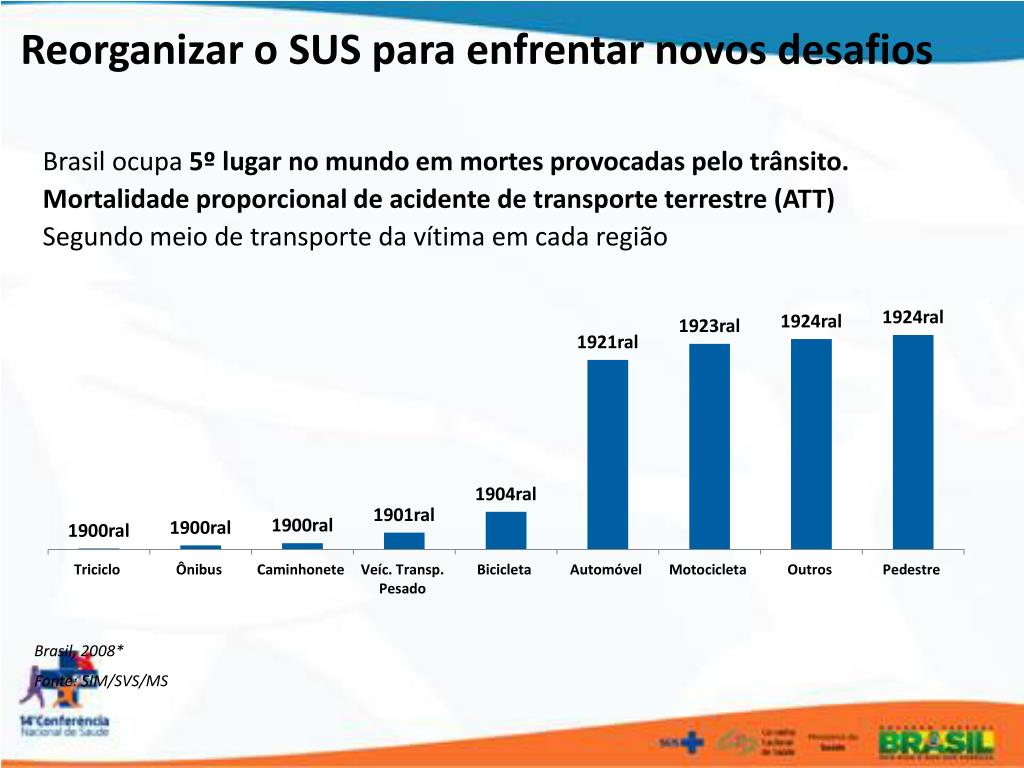 Reorganizar o SUS para enfrentar novos desafios Brasil ocupa 5º lugar no mundo em mortes provocadas pelo trânsito. Mortalidade proporcional de acidente de transporte terrestre (ATT) Segundo meio de transporte da vítima em cada região Brasil, 2008* Fonte: SIM/SVS/MS
