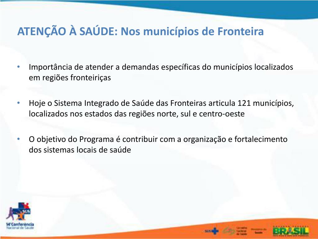 ATENÇÃO À SAÚDE: Nos municípios de Fronteira • Importância de atender a demandas específicas do municípios localizados em regiões fronteiriças • Hoje o Sistema Integrado de Saúde das Fronteiras articula 121 municípios, localizados nos estados das regiões norte, sul e centro-oeste • O objetivo do Programa é contribuir com a organização e fortalecimento dos sistemas locais de saúde