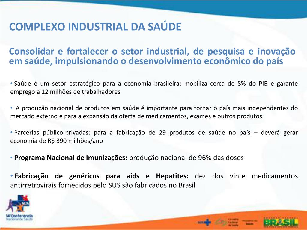 COMPLEXO INDUSTRIAL DA SAÚDE Consolidar e fortalecer o setor industrial, de pesquisa e inovação em saúde, impulsionando o desenvolvimento econômico do país • Saúde é um setor estratégico para a economia brasileira: mobiliza cerca de 8% do PIB e garante emprego a 12 milhões de trabalhadores • A produção nacional de produtos em saúde é importante para tornar o país mais independentes do mercado externo e para a expansão da oferta de medicamentos, exames e outros produtos • Parcerias público-privadas: para a fabricação de 29 produtos de saúde no país – deverá gerar economia de R$ 390 milhões/ano • Programa Nacional de Imunizações: produção nacional de 96% das doses • Fabricação de genéricos para aids e Hepatites: dez dos vinte medicamentos antirretrovirais fornecidos pelo SUS são fabricados no Brasil