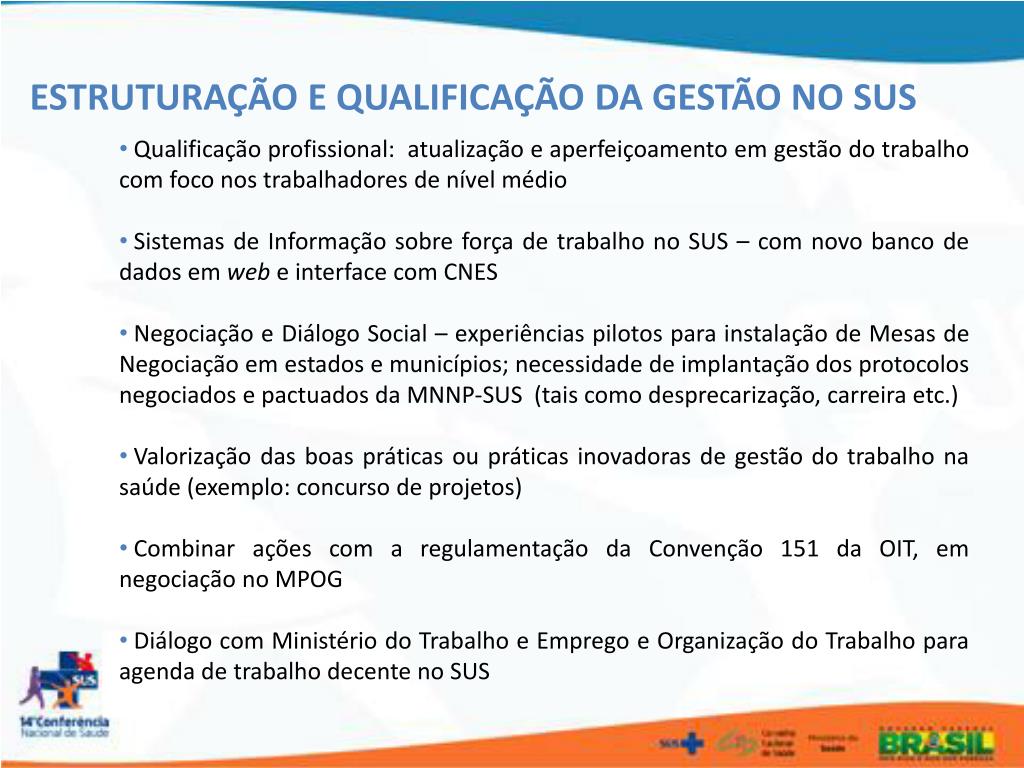 ESTRUTURAÇÃO E QUALIFICAÇÃO DA GESTÃO NO SUS • Qualificação profissional: atualização e aperfeiçoamento em gestão do trabalho com foco nos trabalhadores de nível médio • Sistemas de Informação sobre força de trabalho no SUS – com novo banco de dados em web e interface com CNES • Negociação e Diálogo Social – experiências pilotos para instalação de Mesas de Negociação em estados e municípios; necessidade de implantação dos protocolos negociados e pactuados da MNNP-SUS (tais como desprecarização, carreira etc.) • Valorização das boas práticas ou práticas inovadoras de gestão do trabalho na saúde (exemplo: concurso de projetos) • Combinar ações com a regulamentação da Convenção 151 da OIT, em negociação no MPOG • Diálogo com Ministério do Trabalho e Emprego e Organização do Trabalho para agenda de trabalho decente no SUS