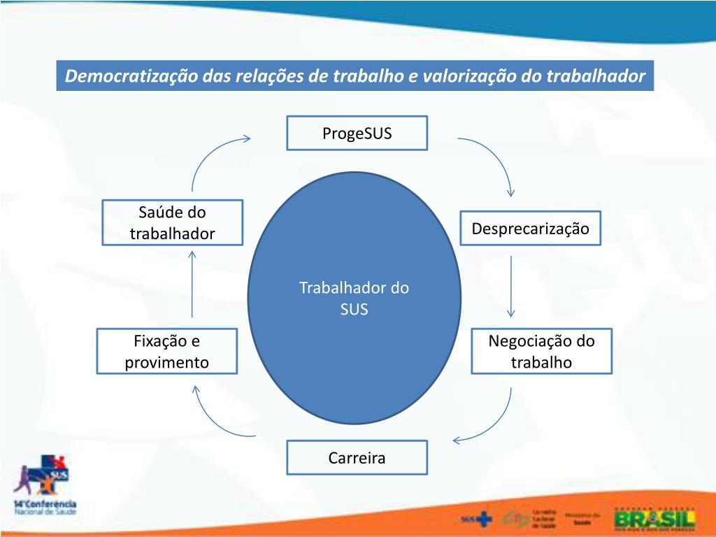 Democratização das relações de trabalho e valorização do trabalhador ProgeSUS Trabalhador do SUS Saúde do trabalhador Desprecarização Fixação e provimento Negociação do trabalho Carreira