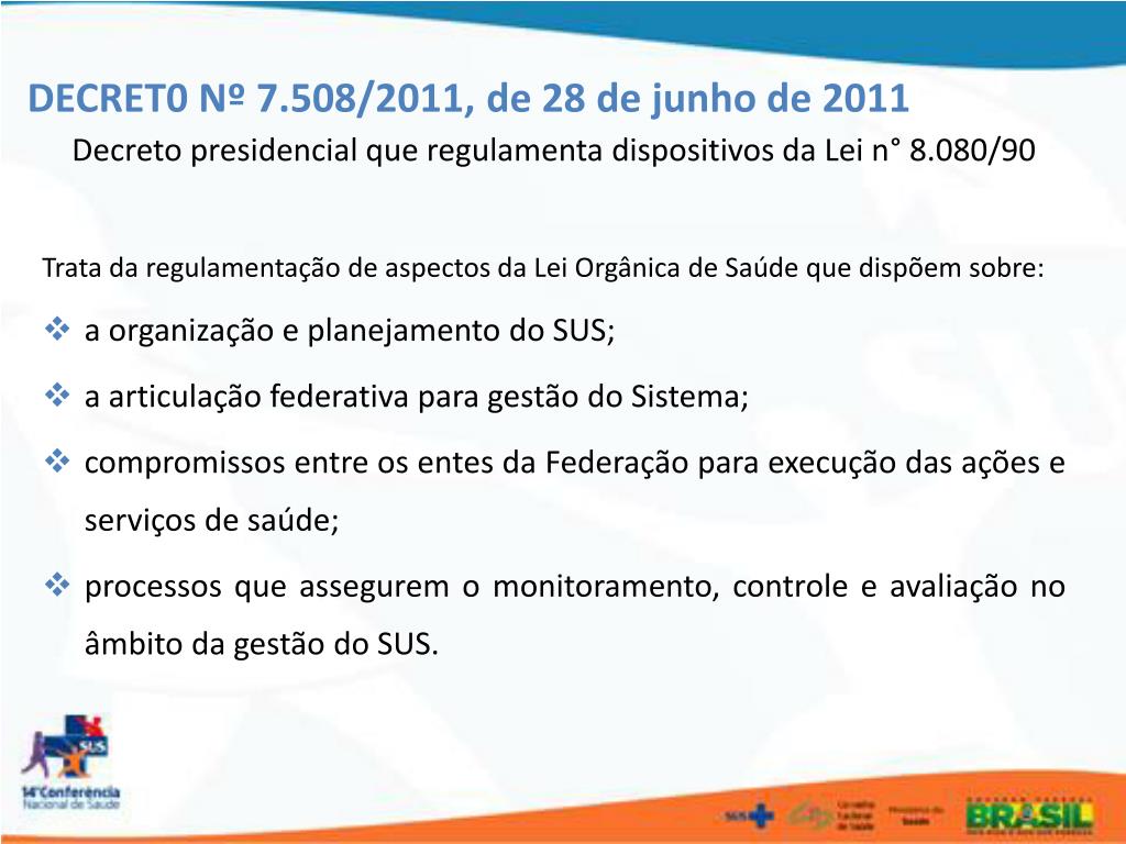 DECRET0 Nº 7.508/2011, de 28 de junho de 2011 Decreto presidencial que regulamenta dispositivos da Lei n° 8.080/90 Trata da regulamentação de aspectos da Lei Orgânica de Saúde que dispõem sobre: • a organização e planejamento do SUS; • a articulação federativa para gestão do Sistema; • compromissos entre os entes da Federação para execução das ações e serviços de saúde; • processos que assegurem o monitoramento, controle e avaliação no âmbito da gestão do SUS.
