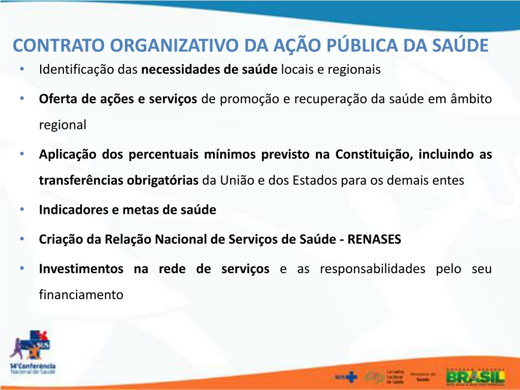 CONTRATO ORGANIZATIVO DA AÇÃO PÚBLICA DA SAÚDE • Identificação das necessidades de saúde locais e regionais • Oferta de ações e serviços de promoção e recuperação da saúde em âmbito regional • Aplicação dos percentuais mínimos previsto na Constituição, incluindo as transferências obrigatórias da União e dos Estados para os demais entes • Indicadores e metas de saúde • Criação da Relação Nacional de Serviços de Saúde - RENASES • Investimentos na rede de serviços e as responsabilidades pelo seu financiamento