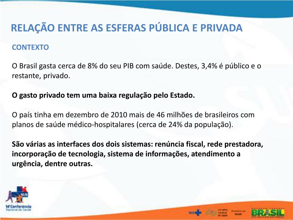RELAÇÃO ENTRE AS ESFERAS PÚBLICA E PRIVADA CONTEXTO O Brasil gasta cerca de 8% do seu PIB com saúde. Destes, 3,4% é público e o restante, privado. O gasto privado tem uma baixa regulação pelo Estado. O país tinha em dezembro de 2010 mais de 46 milhões de brasileiros com planos de saúde médico-hospitalares (cerca de 24% da população). São várias as interfaces dos dois sistemas: renúncia fiscal, rede prestadora, incorporação de tecnologia, sistema de informações, atendimento a urgência, dentre outras.