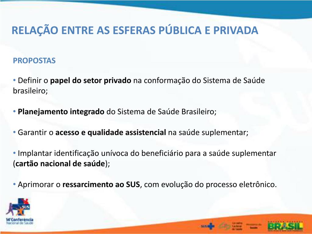 RELAÇÃO ENTRE AS ESFERAS PÚBLICA E PRIVADA • PROPOSTAS • Definir o papel do setor privado na conformação do Sistema de Saúde brasileiro; • Planejamento integrado do Sistema de Saúde Brasileiro; • Garantir o acesso e qualidade assistencial na saúde suplementar; • Implantar identificação unívoca do beneficiário para a saúde suplementar (cartão nacional de saúde); • Aprimorar o ressarcimento ao SUS, com evolução do processo eletrônico.