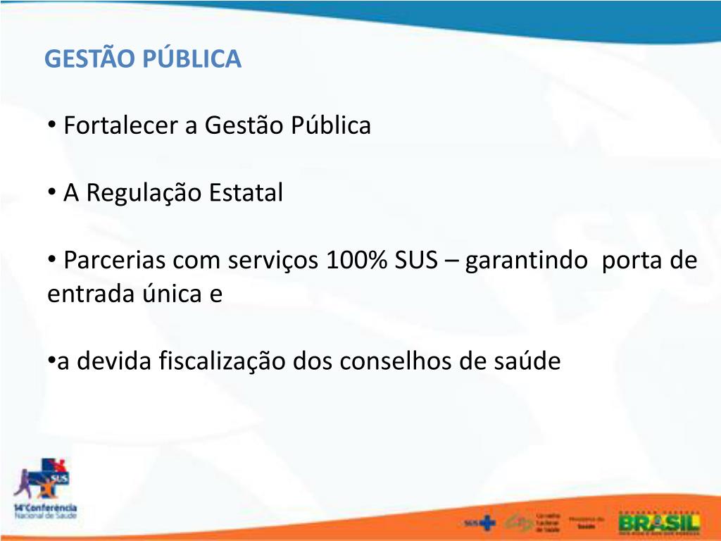 GESTÃO PÚBLICA • Fortalecer a Gestão Pública • A Regulação Estatal • Parcerias com serviços 100% SUS – garantindo porta de entrada única e • a devida fiscalização dos conselhos de saúde