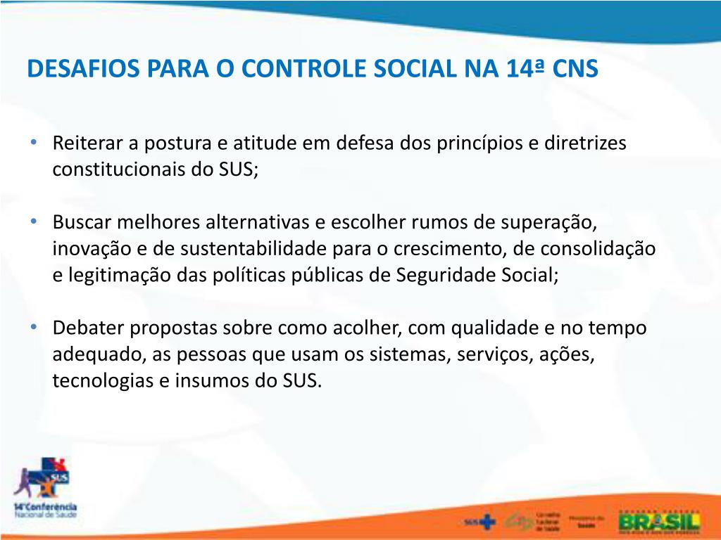 DESAFIOS PARA O CONTROLE SOCIAL NA 14ª CNS • Reiterar a postura e atitude em defesa dos princípios e diretrizes constitucionais do SUS; • Buscar melhores alternativas e escolher rumos de superação, inovação e de sustentabilidade para o crescimento, de consolidação e legitimação das políticas públicas de Seguridade Social; • Debater propostas sobre como acolher, com qualidade e no tempo adequado, as pessoas que usam os sistemas, serviços, ações, tecnologias e insumos do SUS.