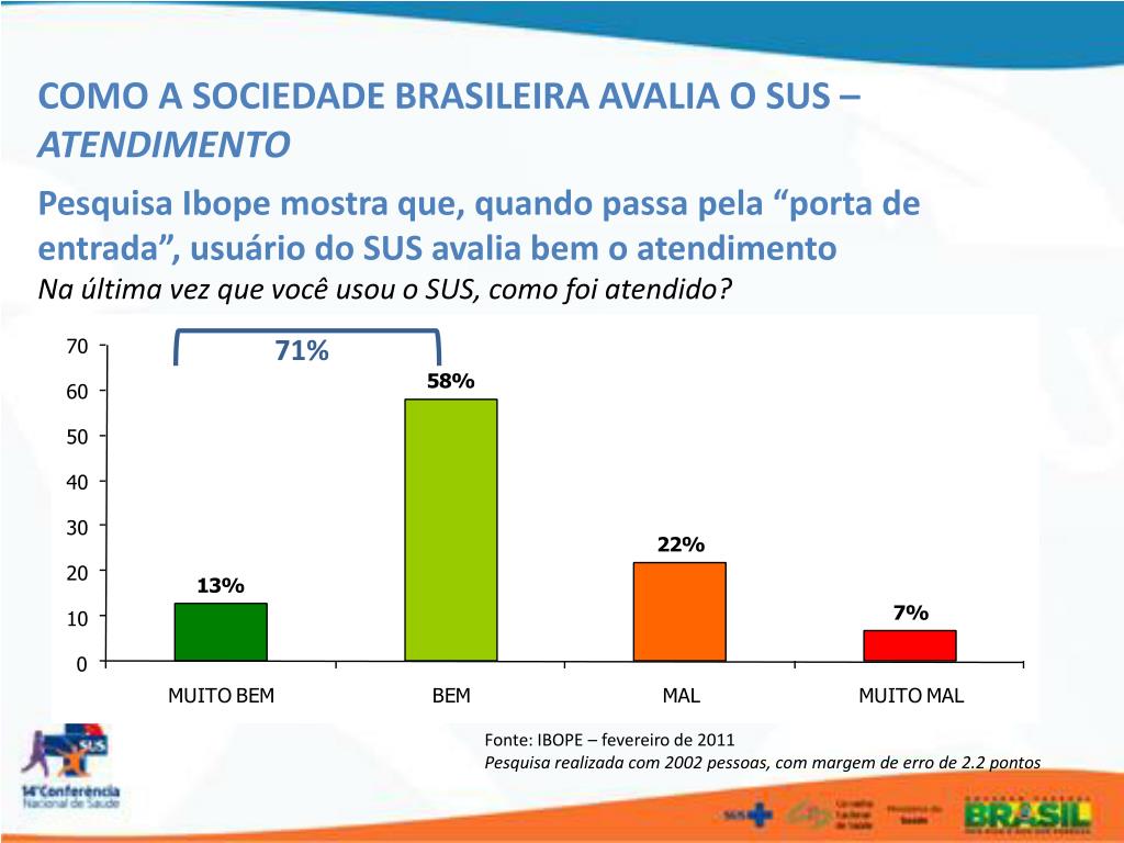 COMO A SOCIEDADE BRASILEIRA AVALIA O SUS – ATENDIMENTO Pesquisa Ibope mostra que, quando passa pela “porta de entrada”, usuário do SUS avalia bem o atendimento Na última vez que você usou o SUS, como foi atendido? 71% Fonte: IBOPE – fevereiro de 2011 Pesquisa realizada com 2002 pessoas, com margem de erro de 2.2 pontos
