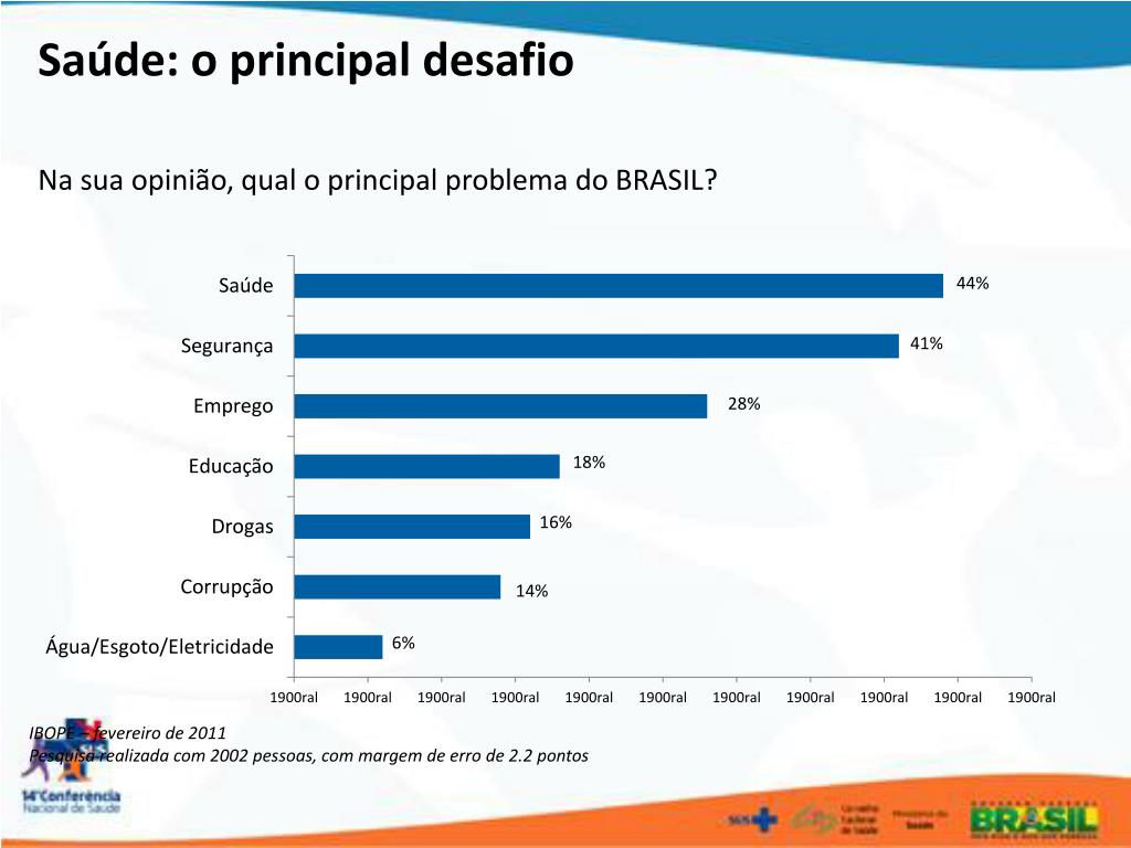 Saúde: o principal desafio Na sua opinião, qual o principal problema do BRASIL? IBOPE – fevereiro de 2011 Pesquisa realizada com 2002 pessoas, com margem de erro de 2.2 pontos