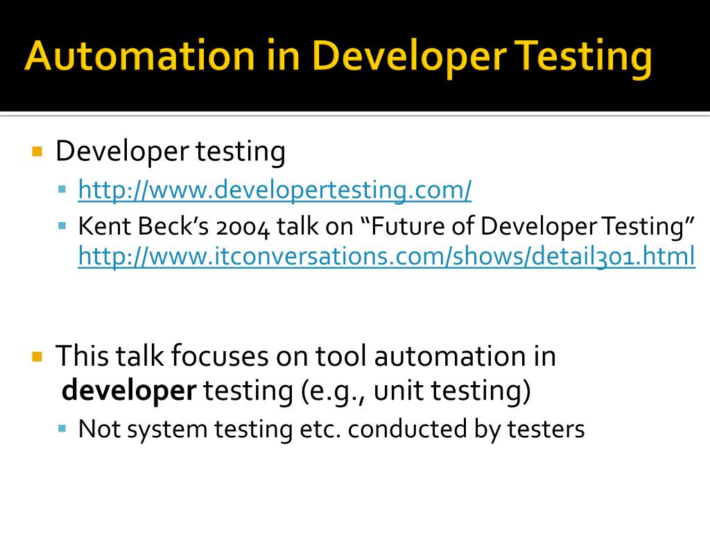 Automation in Developer Testing • Developer testing • http://www.developertesting.com/ • Kent Beck’s 2004 talk on “Future of Developer Testing”http://www.itconversations.com/shows/detail301.html • This talk focuses on tool automation indeveloper testing (e.g., unit testing) • Not system testing etc. conducted by testers