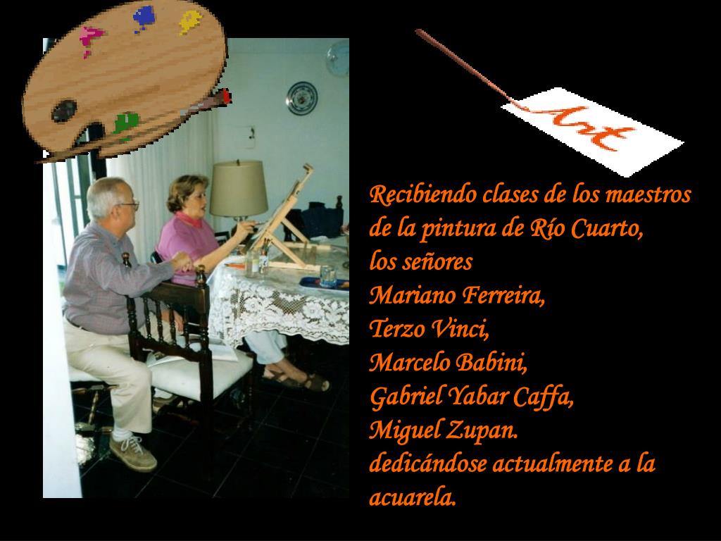 Recibiendo clases de los maestros de la pintura de Río Cuarto, los señores Mariano Ferreira, Terzo Vinci, Marcelo Babini, Gabriel Yabar Caffa, Miguel Zupan. dedicándose actualmente a la acuarela.