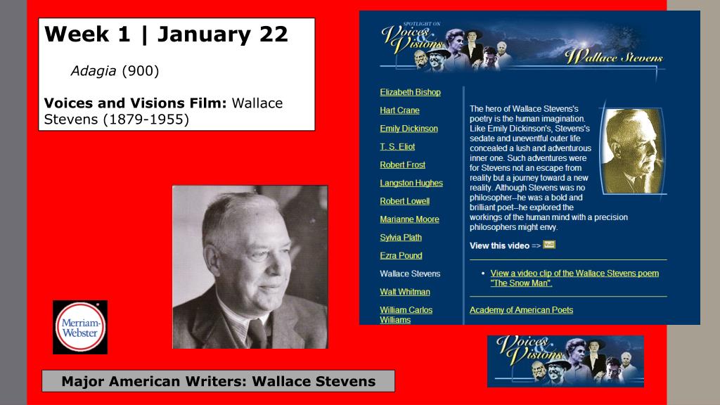 Week 1 | January 22 • Adagia(900) • Voices and Visions Film: Wallace Stevens (1879-1955) Major American Writers: Wallace Stevens