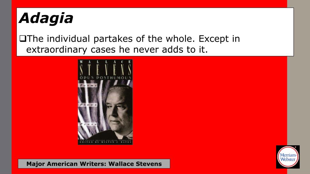 Adagia • The individual partakes of the whole. Except in extraordinary cases he never adds to it. Major American Writers: Wallace Stevens