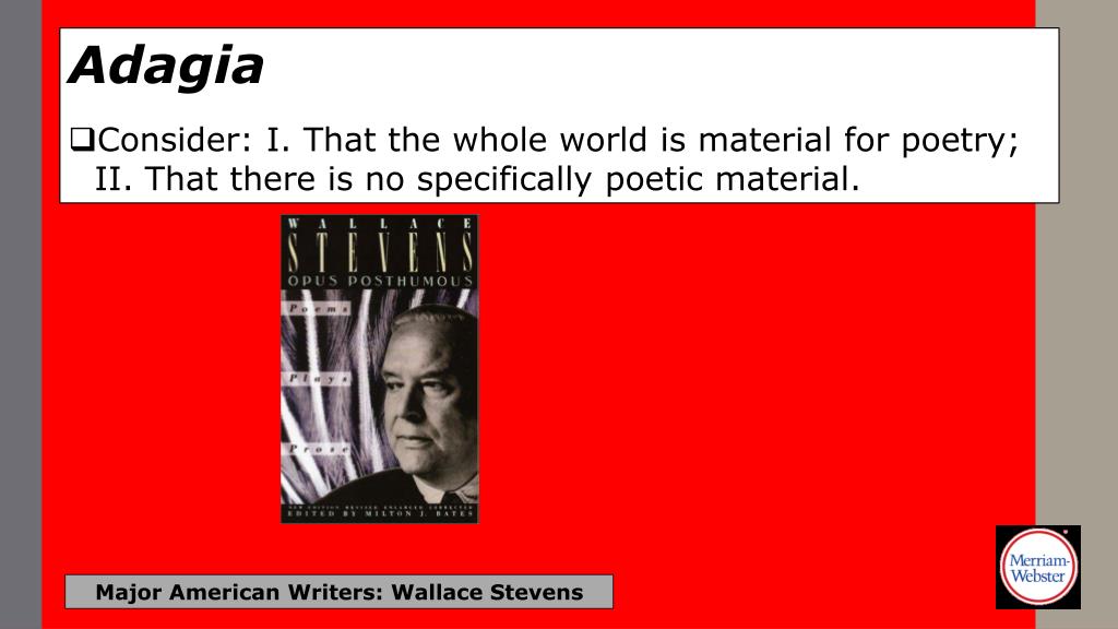 Adagia • Consider: I. That the whole world is material for poetry; II. That there is no specifically poetic material. Major American Writers: Wallace Stevens