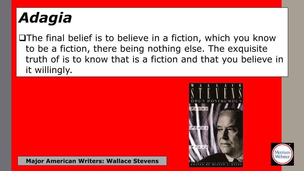 Adagia • The final belief is to believe in a fiction, which you know to be a fiction, there being nothing else. The exquisite truth of is to know that is a fiction and that you believe in it willingly. Major American Writers: Wallace Stevens