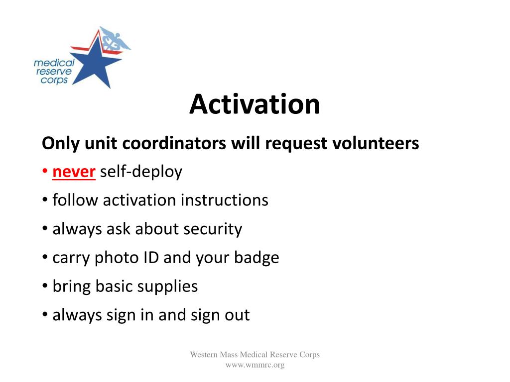 Activation Only unit coordinators will request volunteers • neverself-deploy • follow activation instructions • always ask about security • carry photo ID and your badge • bring basic supplies • always sign in and sign out Western Mass Medical Reserve Corps www.wmmrc.org