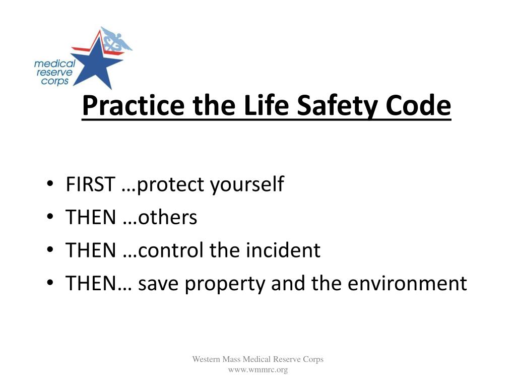 Practice the Life Safety Code • FIRST …protect yourself • THEN …others • THEN …control the incident • THEN… save property and the environment Western Mass Medical Reserve Corps www.wmmrc.org