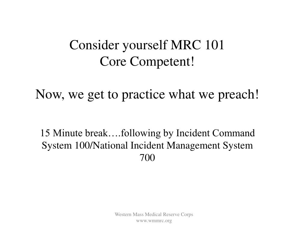 Consider yourself MRC 101 Core Competent! Now, we get to practice what we preach! 15 Minute break….following by Incident Command System 100/National Incident Management System 700 Western Mass Medical Reserve Corps www.wmmrc.org