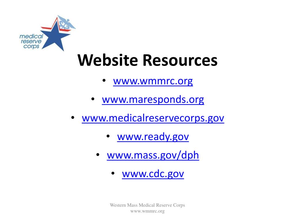 Website Resources • www.wmmrc.org • www.maresponds.org • www.medicalreservecorps.gov • www.ready.gov • www.mass.gov/dph • www.cdc.gov Western Mass Medical Reserve Corps www.wmmrc.org