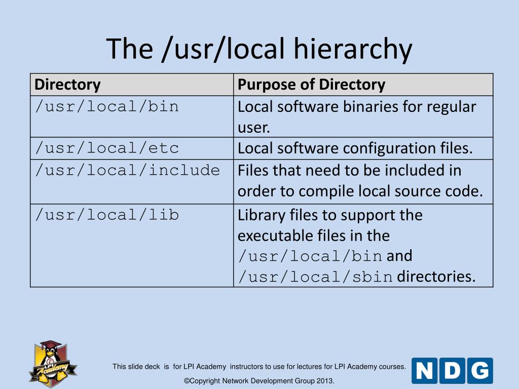User Binary Directories Binary directories contain the programs (not necessarily actually all binary files) that users and administrators execute to start processes or applications running Those whose name is "bin" are intended for ordinary users and include: /bin, /usr/bin and /usr/local/bin Third-party applications may also store their executables in /usr/local/application/bin or /opt/application/bin Users may have their own "bin" in their home directory, like /home/bob/bin
