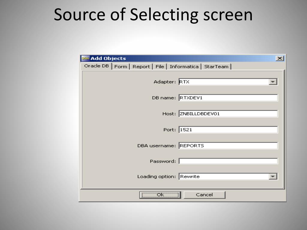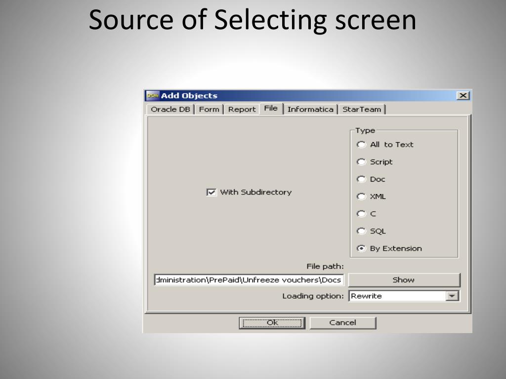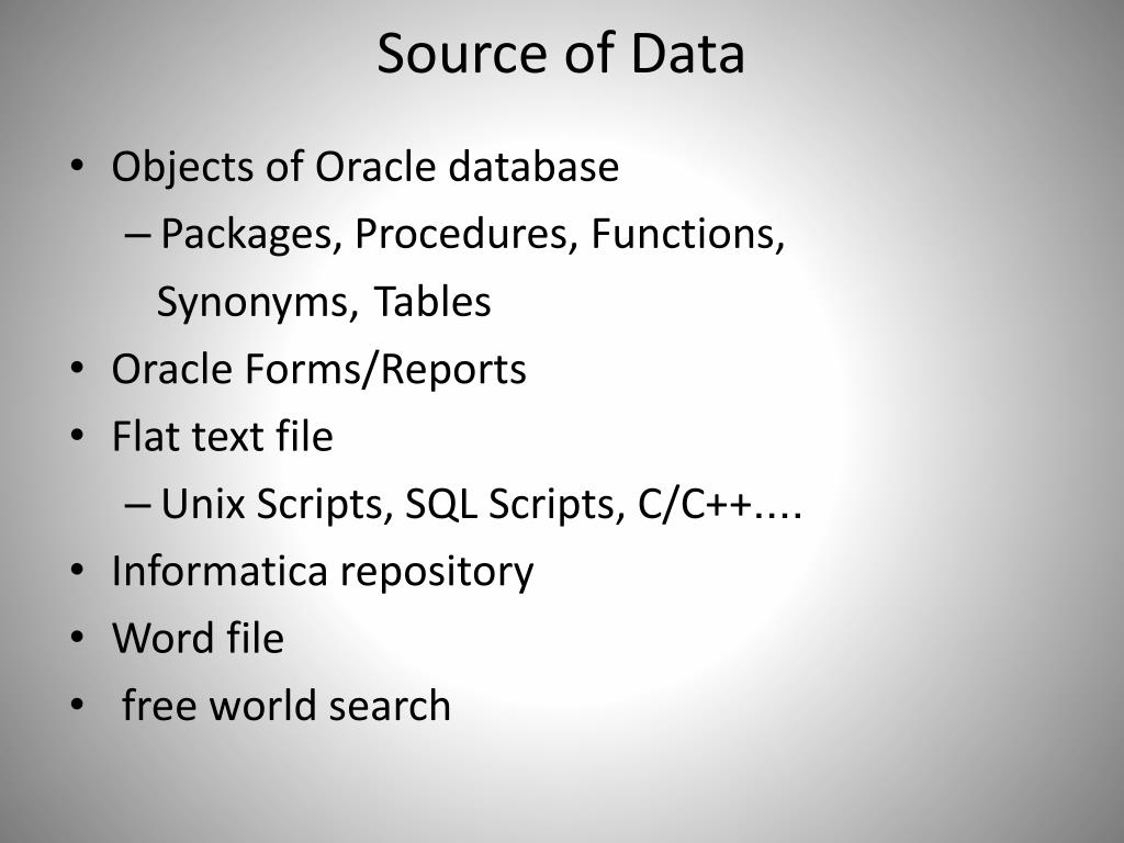 Source of Data • Objects of Oracle database • Packages, Procedures, Functions, Synonyms,Tables • Oracle Forms/Reports • Flat text file • Unix Scripts, SQL Scripts, C/C++.... • Informatica repository • Word file • free world search