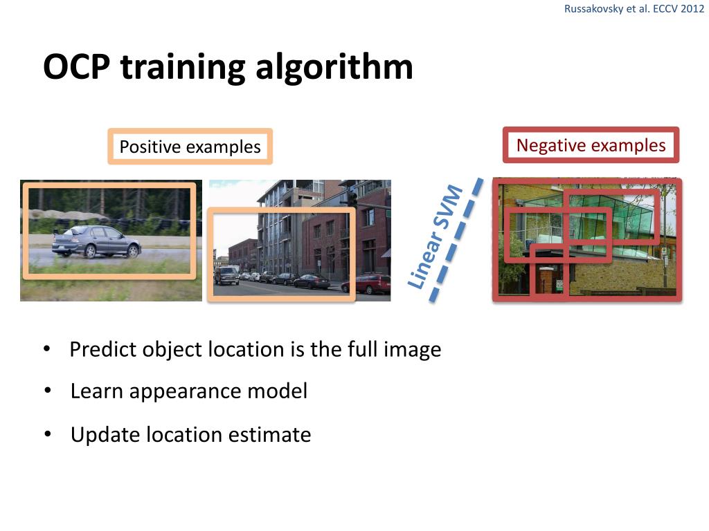 OCP training algorithm Negative examples Positive examples Linear SVM • Predict object location is the full image • Learn appearance model