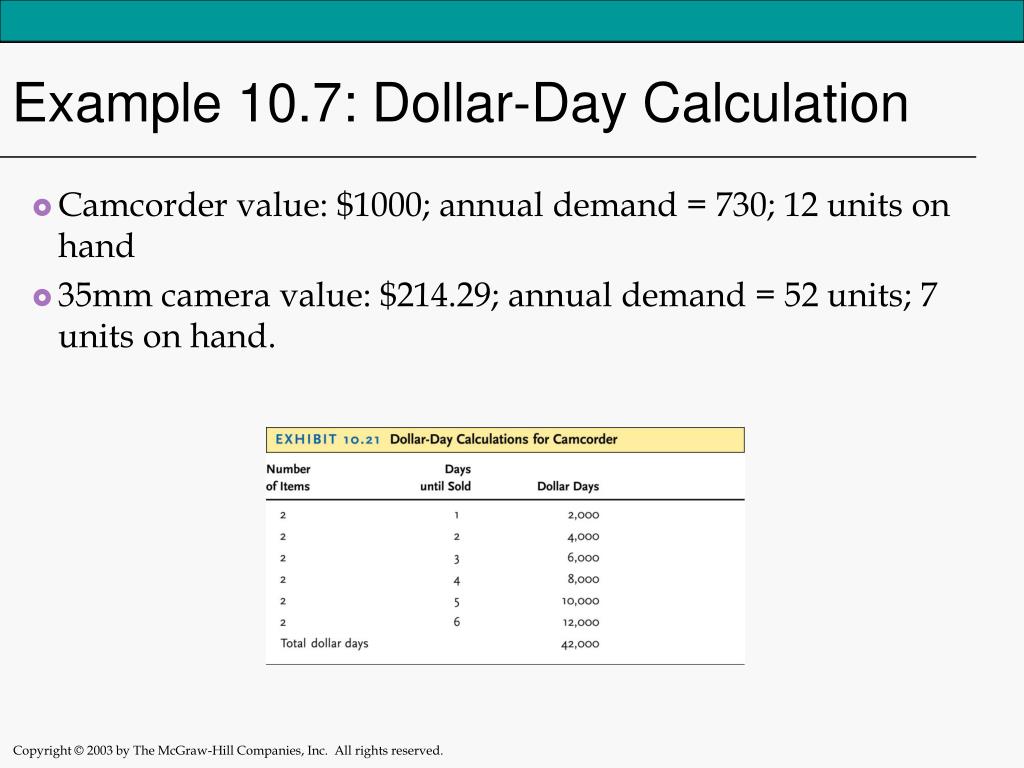 Example 10.7: Dollar-Day Calculation • Camcorder value: $1000; annual demand = 730; 12 units on hand • 35mm camera value: $214.29; annual demand = 52 units; 7 units on hand.