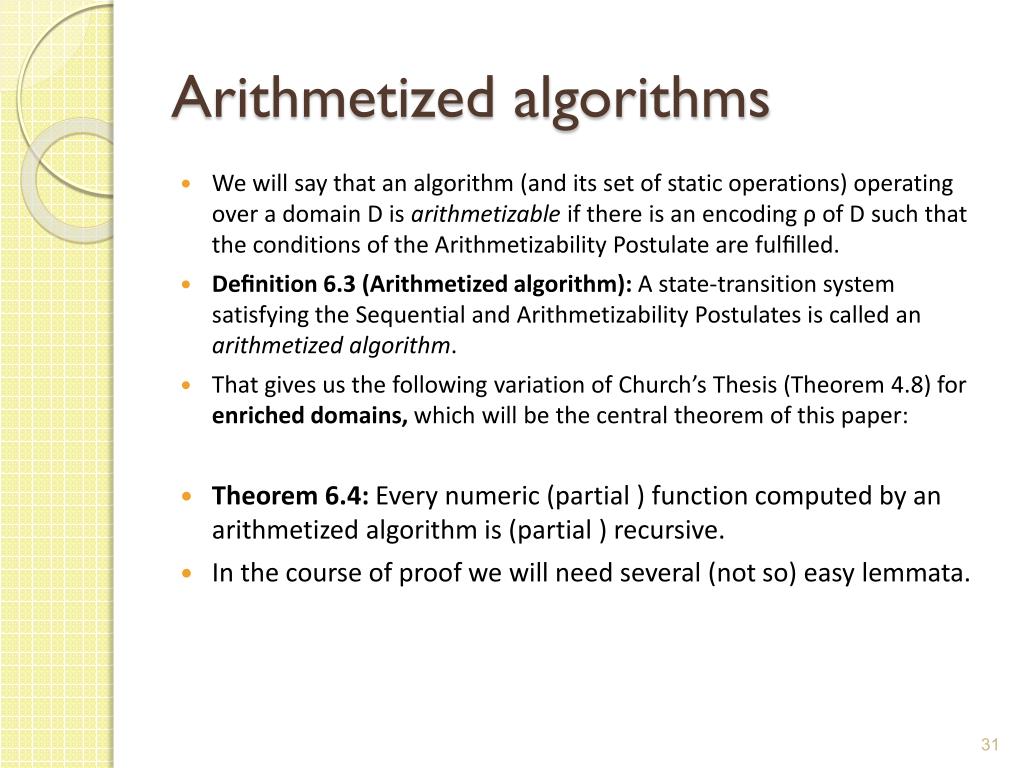 Arithmetized algorithms • We will say that an algorithm (and its set of static operations) operating over a domain D is arithmetizable if there is an encoding ρ of D such that the conditions of the Arithmetizability Postulate are fulfilled. • Definition 6.3 (Arithmetized algorithm): A state-transition system satisfying the Sequential and Arithmetizability Postulates is called an arithmetized algorithm. • That gives us the following variation of Church’s Thesis (Theorem 4.8) for enriched domains, which will be the central theorem of this paper: • Theorem 6.4: Every numeric (partial ) function computed by an arithmetized algorithm is (partial ) recursive. • In the course of proof we will need several (not so) easy lemmata.
