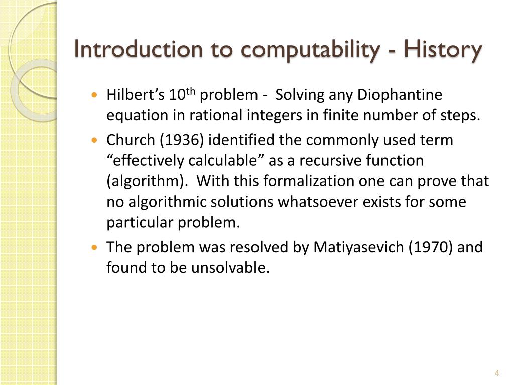 Introduction to computability - History • Hilbert’s 10th problem - Solving any Diophantine equation in rational integers in finite number of steps. • Church (1936) identified the commonly used term “effectively calculable” as a recursive function (algorithm). With this formalization one can prove that no algorithmic solutions whatsoever exists for some particular problem. • The problem was resolved by Matiyasevich (1970) and found to be unsolvable.