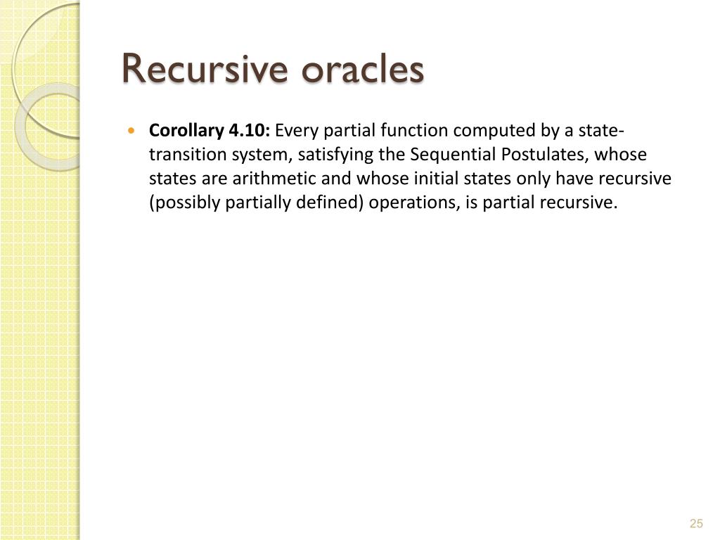 Recursive oracles • Corollary 4.10: Every partial function computed by a state-transition system, satisfying the Sequential Postulates, whose states are arithmetic and whose initial states only have recursive (possibly partially defined) operations, is partial recursive.