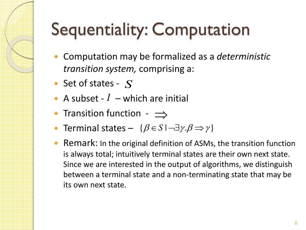 Sequentiality: Computation • Computation may be formalized as a deterministic transition system, comprising a: • Set of states - • A subset - – which are initial • Transition function - • Terminal states – • Remark: In the original definition of ASMs, the transition function is always total; intuitively terminal states are their own next state. Since we are interested in the output of algorithms, we distinguish between a terminal state and a non-terminating state that may be its own next state.