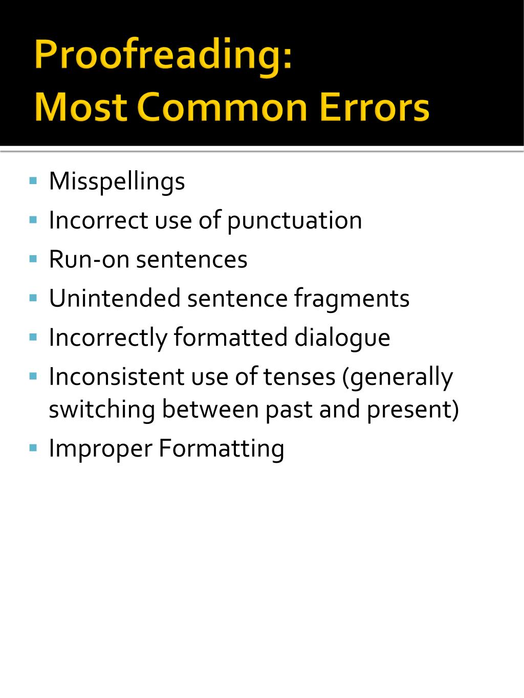 Proofreading:Most Common Errors • Misspellings • Incorrect use of punctuation • Run-on sentences • Unintended sentence fragments • Incorrectly formatted dialogue • Inconsistent use of tenses (generally switching between past and present) • Improper Formatting