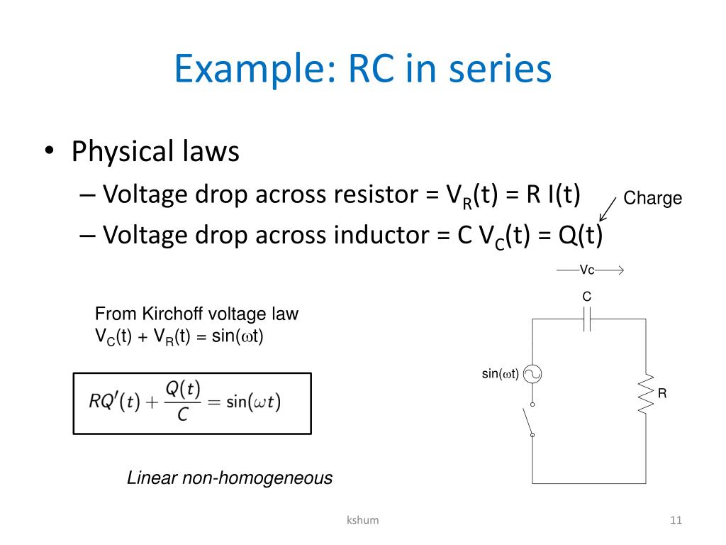 Example: RC in series • Physical laws • Voltage drop across resistor = VR(t) = R I(t) • Voltage drop across inductor = C VC(t) = Q(t) Charge From Kirchoff voltage lawVC(t) + VR(t) = sin(t) Linear non-homogeneous kshum