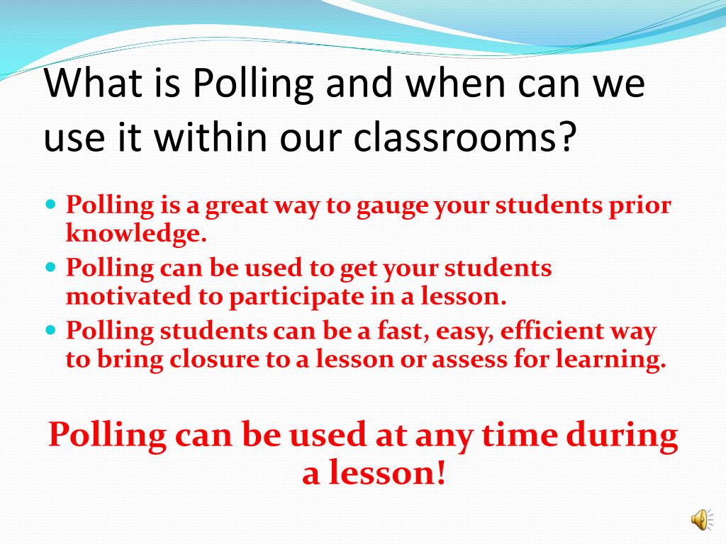 Polling In-Service Presentation. What is Polling and when can we use it within our classrooms?. Polling is a great way to gauge your students prior knowledge. Polling can be used to get your students motivated to participate in a lesson.