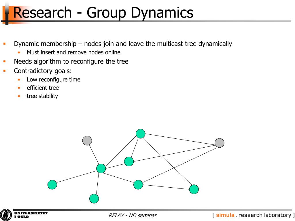 Research - Group Dynamics • Dynamic membership – nodes join and leave the multicast tree dynamically • Must insert and remove nodes online • Needs algorithm to reconfigure the tree • Contradictory goals: • Low reconfigure time • efficient tree • tree stability