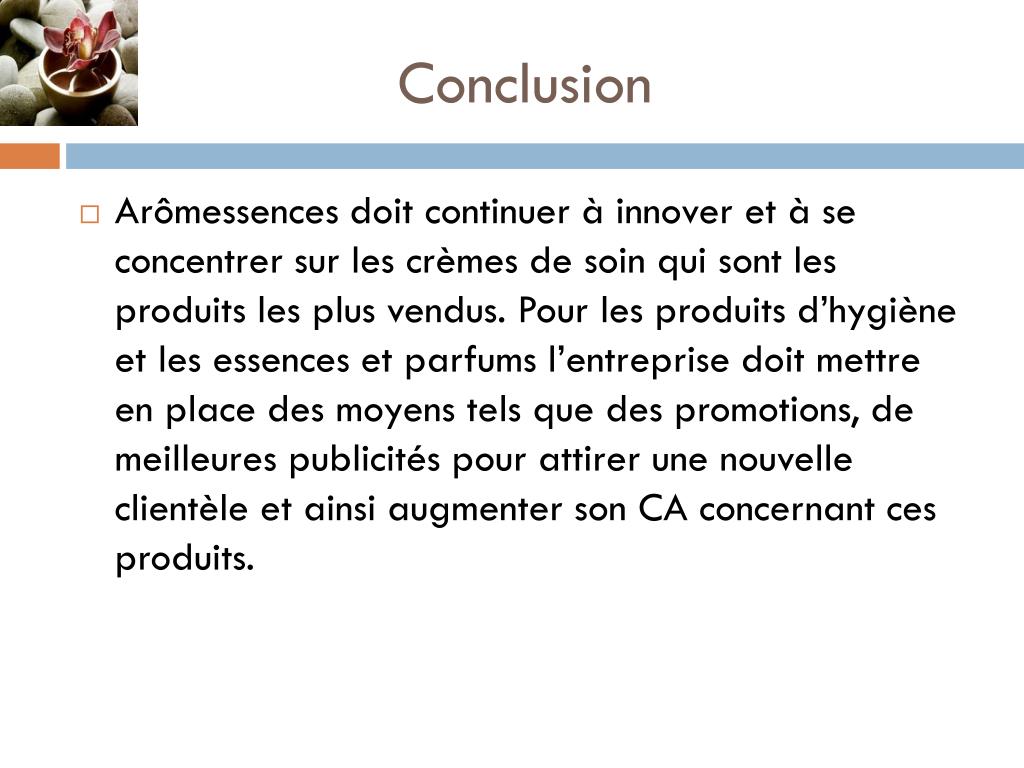 Conclusion • Arômessences doit continuer à innover et à se concentrer sur les crèmes de soin qui sont les produits les plus vendus. Pour les produits d’hygiène et les essences et parfums l’entreprise doit mettre en place des moyens tels que des promotions, de meilleures publicités pour attirer une nouvelle clientèle et ainsi augmenter son CA concernant ces produits.