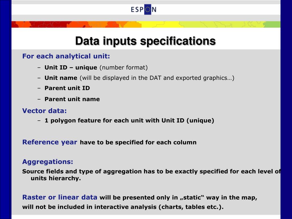 Data inputs specifications For each analytical unit: Unit ID – unique(number format) Unit name(will be displayed in the DAT and exported graphics…) Parent unit ID Parent unit name Vector data: 1 polygon feature for each unit with Unit ID (unique) Reference yearhave to be specified for each column Aggregations: Source fields and type of aggregation has to be exactly specified for each level of units hierarchy. Raster or linear data will be presented only in „static“ way in the map, will not be included in interactive analysis (charts, tables etc.).