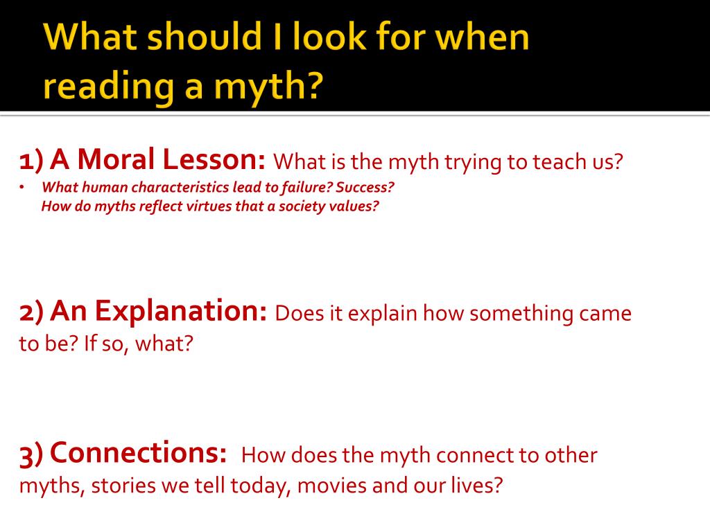 What should I look for when reading a myth? • 1) A Moral Lesson: What is the myth trying to teach us? • What human characteristics lead to failure? Success?How do myths reflect virtues that a society values? • 2) An Explanation: Does it explain how something came to be? If so, what? • 3) Connections: How does the myth connect to other myths, stories we tell today, movies and our lives?
