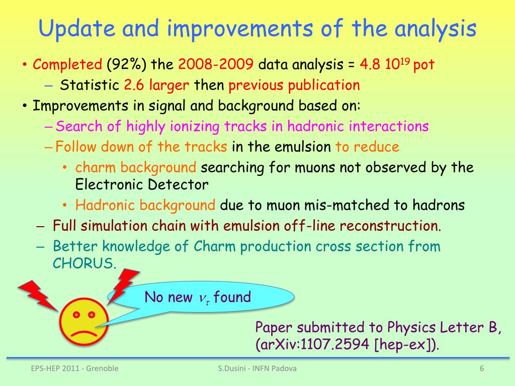 Update and improvements of the analysis • Completed (92%) the 2008-2009 data analysis = 4.8 1019 pot • Statistic2.6 larger then previous publication • Improvements in signal and background based on: • Search of highly ionizing tracks in hadronic interactions • Follow down of the tracks in the emulsion to reduce • charm background searching for muons not observed by the Electronic Detector • Hadronic background due to muonmis-matched to hadrons • Full simulation chain with emulsion off-line reconstruction. • Better knowledge of Charm production cross section from CHORUS. No new nt found Paper submitted to Physics Letter B, (arXiv:1107.2594 [hep-ex]). S.Dusini - INFN Padova
