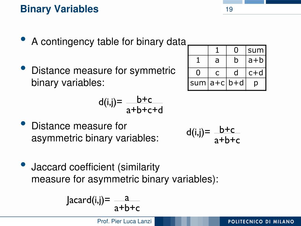Object j Object i Binary Variables • A contingency table for binary data • Distance measure for symmetric binary variables: • Distance measure for asymmetric binary variables: • Jaccard coefficient (similarity measure for asymmetric binary variables):