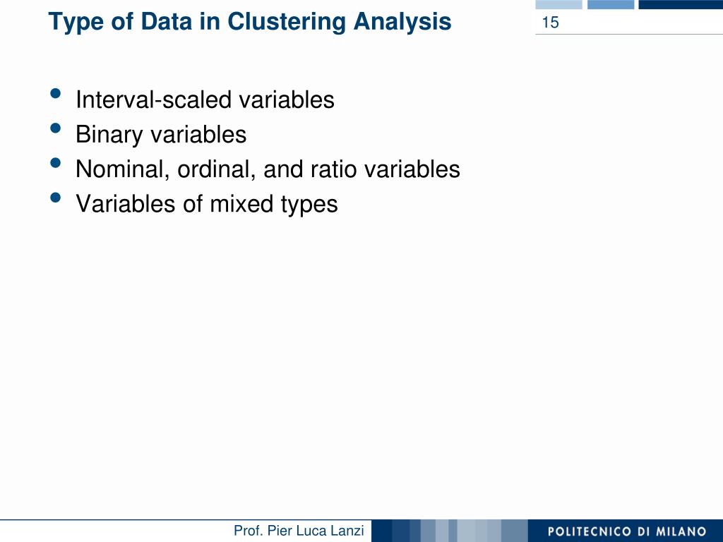 Type of Data in Clustering Analysis • Interval-scaled variables • Binary variables • Nominal, ordinal, and ratio variables • Variables of mixed types