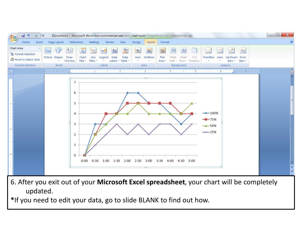 6. After you exit out of your Microsoft Excel spreadsheet, your chart will be completely updated. *If you need to edit your data, go to slide BLANK to find out how.