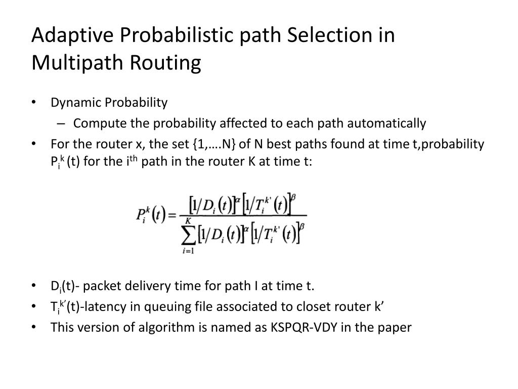 Adaptive Probabilistic path Selection in Multipath Routing • Dynamic Probability • Compute the probability affected to each path automatically • For the router x, the set {1,….N} of N best paths found at time t,probabilityPik(t) for the ith path in the router K at time t: • Di(t)- packet delivery time for path I at time t. • Tik’(t)-latency in queuing file associated to closet router k’ • This version of algorithm is named as KSPQR-VDY in the paper